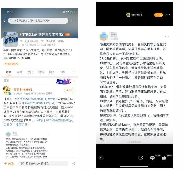 網(wǎng)傳字節(jié)28歲員工猝死,流出截圖顯示該員工家屬目前已懷孕兩個月,并且家庭背負了大額房貸,目前無力支撐房貸,尋求解決辦法。此后字節(jié)跳動回應(yīng)時提供了內(nèi)網(wǎng)發(fā)文截圖,圖片中稱該同學21日在健身房運動時舉止異常,由教練撥打120叫來急救人員到場救治后送上救護車,截至23日0:30仍在醫(yī)院搶救中。
