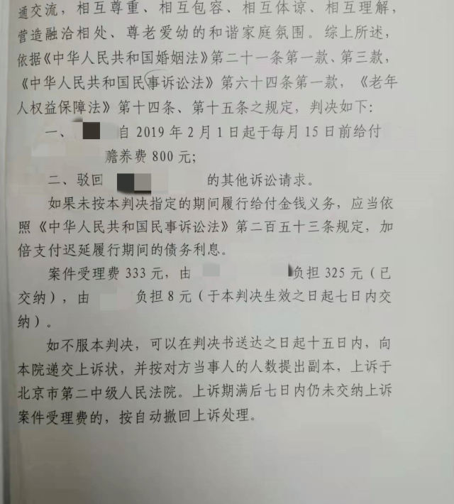 最終法院支持了王國龍律師的主張,判決給付原告贍養費800元,并駁回原告的其他訴訟請求。