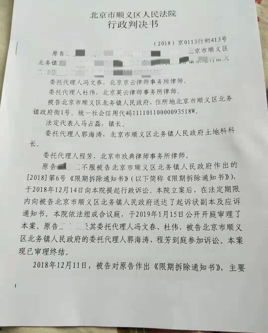 本案,經(jīng)過京云律師的努力,成功撤銷了順義區(qū)北務(wù)鎮(zhèn)人民政府作出的《限期拆除通知書》,保住了王先生一家的房子。